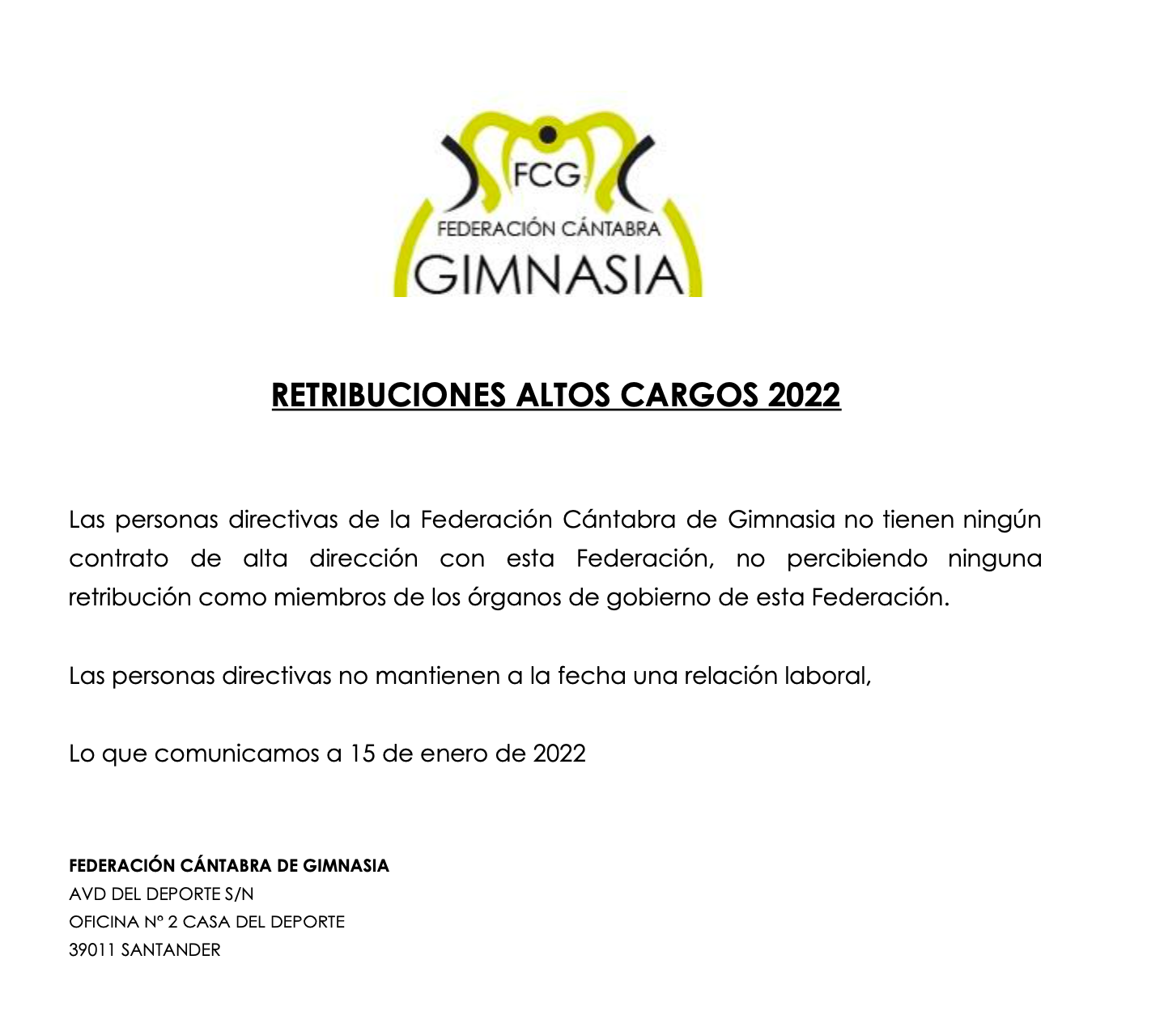 La Federación Cántabra de Gimnasia, en adelante FCG, ostenta la representación oficial exclusiva del deporte del gimnasia y todas sus diferentes modalidades: gimnasia rítmica, gimnasia artística, gimnasia aeróbica, trampolín, parkour, gimnasia general y gimnasia acrobática, en el territorio de la Comunidad Autónoma de Cantabria a efectos públicos y goza de personalidad jurídica, patrimonio propio y capacidad de obrar para el cumplimiento de sus fines, de conformidad con lo establecido en el artículo 33.1 de la lley 15/1994.